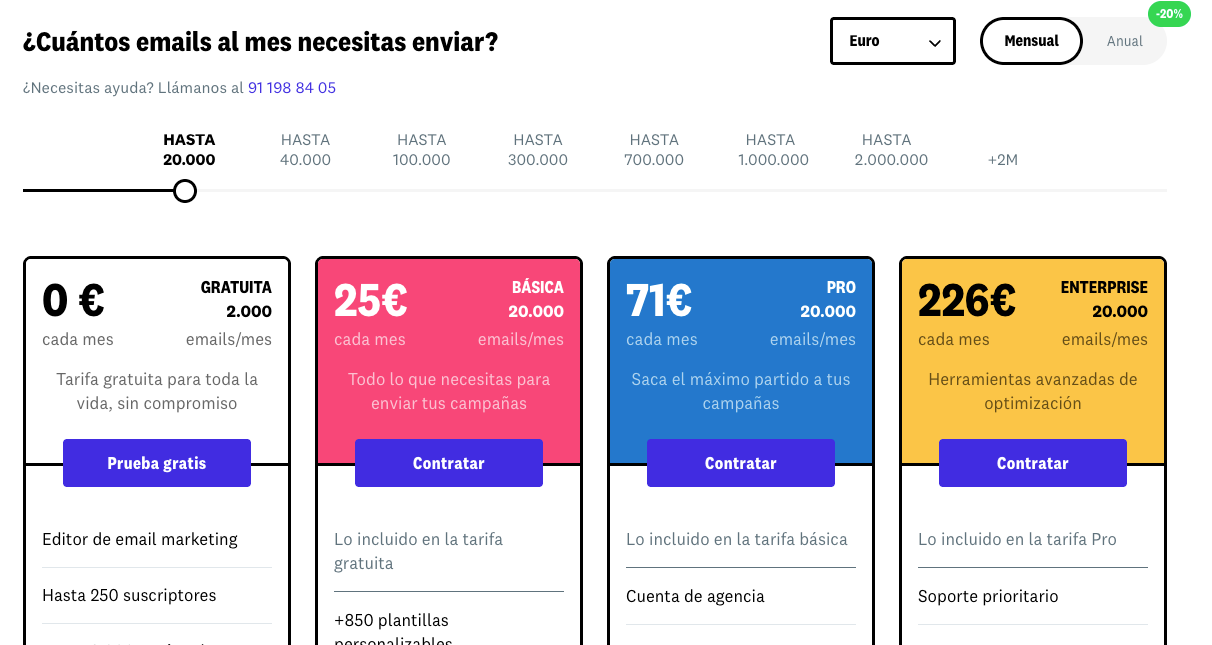 - Sus 5.000 emails están limitados a 500 contactos. Para hacer una equivalente a nuestra primera tarifa, hay que subir hasta 20.000 emails al mes a contactos ilimitados. Ya vamos por 30,60€ al mes.