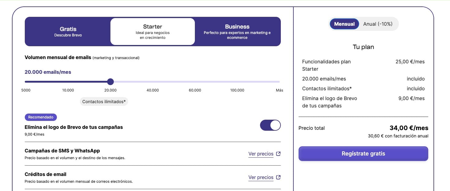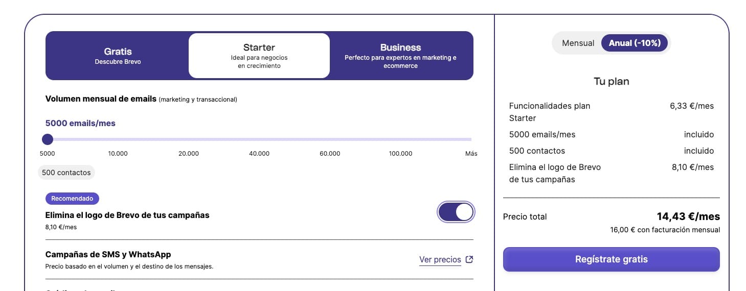 - En primer lugar, si quieres eliminar su logo de tus campañas, tienes que sumar 8,10€ al mes (14,43€ en total)